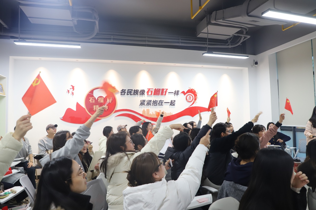 知识竞赛设置互动与答题两大环节。在“民族语言传话”互动环节中,同学们通过模拟多民族语言交流场景,切身感受中华文化的多样性与包容性,在轻松的氛围中增强了文化认同与民族情感。在答题环节中,各代表队手持红旗、踊跃抢答,现场气氛热烈,展现出团结协作、积极向上的精神风貌。