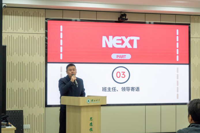 在认真听取师生发言后,吴明新对本次主题班会的组织形式与育人成效给予充分肯定。他结合个人成长经历寄语同学们,要珍惜伟大时代与青春年华,充分利用国家、社会和学校提供的宝贵平台,勇于尝试、敢于探索,在实践锻炼中不断提升解决实际问题的能力。他强调,青年大学生是中华民族伟大复兴征程上的生力军,要坚定“强国有我”的信念,将个人理想追求主动融入国家发展大局。他勉励同学们要厚植爱校荣校情怀,不忘初心、砥砺奋进,努力成长为可堪大任的栋梁之材。