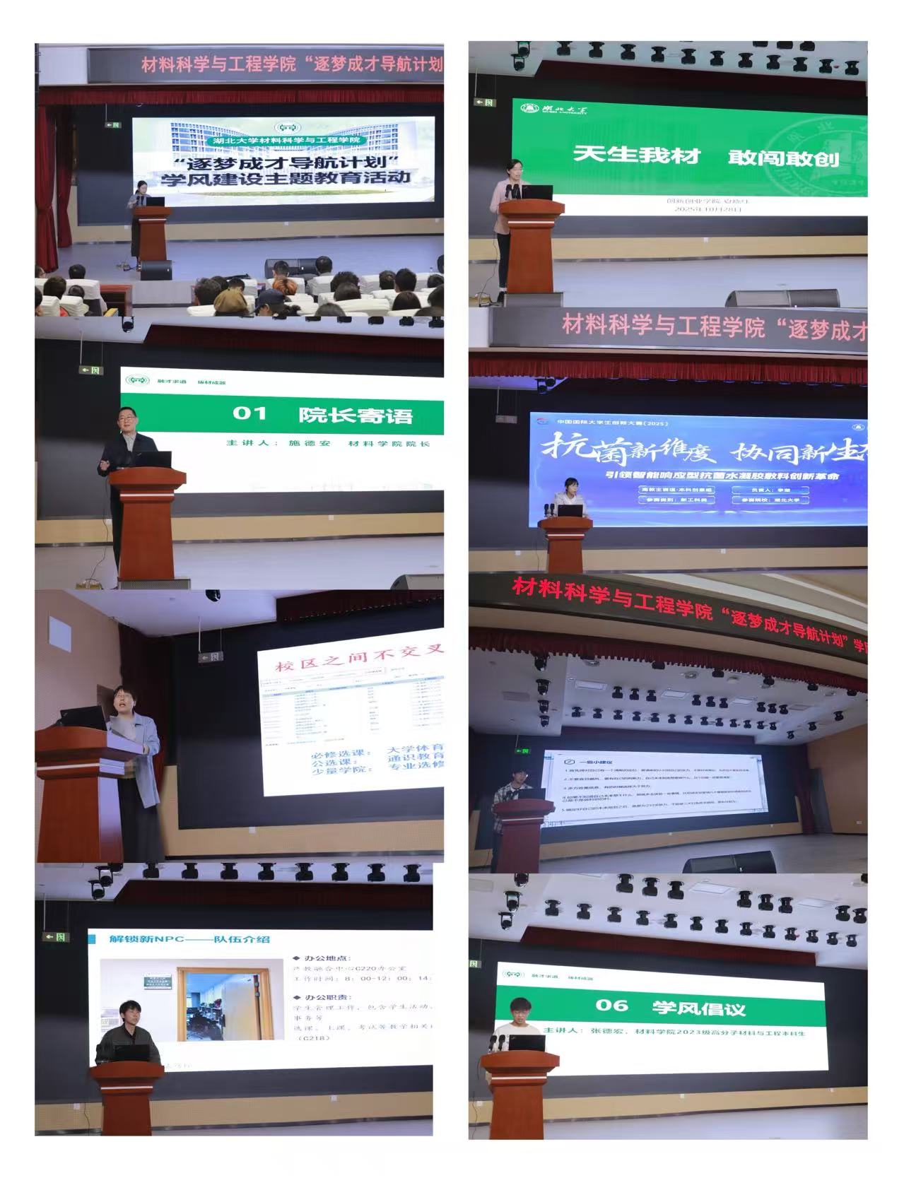 10月28日晚上18点,材料学院“逐梦成才导航计划”学风建设主题教育活动在长江新区校区产教融合中心报告厅顺利举行。创新创业学院院长、楚才学院院长夏晓红,材料学院院长施德安,党委副书记鲁力格格,副院长尤俊等领导出席活动,学院2024、2025级全体442名本科生参会,活动由学院党委副书记鲁力格格主持。