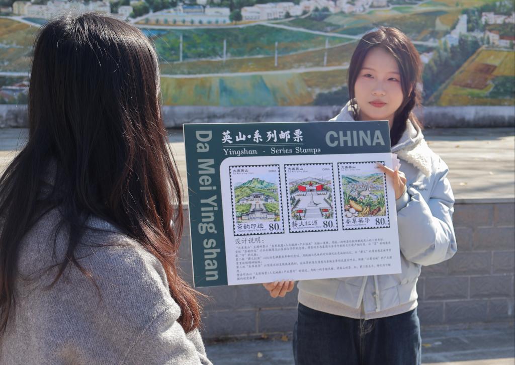 “分享·艺融英山”阶段,视传2303班开展英山乡村振兴主题设计成果分享会。学生以英山茶叶、山水、中草药等元素设计主题活动,依次展示为英山量身创作的设计作品“大美英山”邮票设计、“英山药灵”IP设计、“执笔英山”插画设计等。“《寻味英山魂》插画设计以英山红色底蕴与生态禀赋为核心,设计元素萃取烈士纪念馆、纪念碑等红色建筑的轮廓,融入大别山山脉雄浑肌理,同步打造天麻、茯苓、丹参三大中草药IP形象,将药材形态转化为灵动视觉符号,凸显英山特色。”学生们分享道。