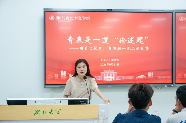 接下来,湖北省“大学生自强之星”、2023级马克思主义理论专业硕士研究生王贞懿上台讲述了她投身于学生工作中所收获的成长。“相信自己是内心进阶的开始。”她笑着说,“青春是一道‘论述题’,最动人的风景在于自由探索的万水千山。”她还分享了自己去到来凤县高级中学支教的经历和在武汉革命博物馆讲“红巷党史”的故事,建议2024级的学生们把论文写在祖国大地上,写在革命精神中,写在社会实践里。