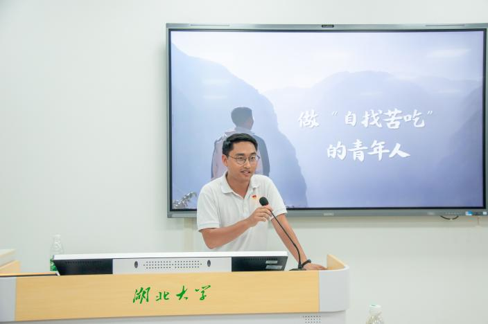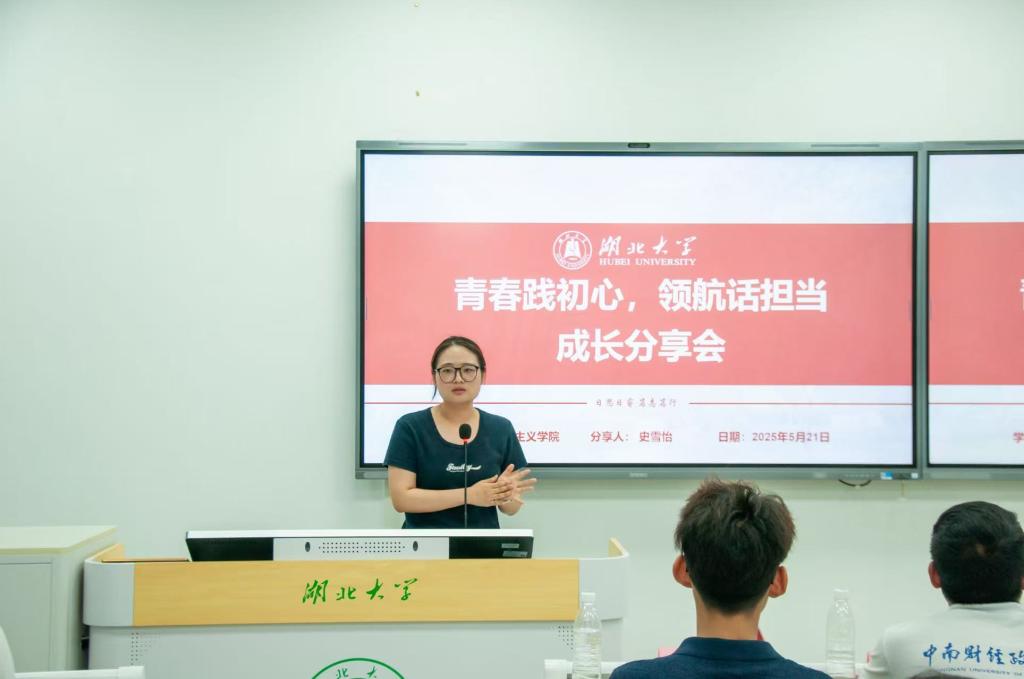 “遇见光,追随光,成为光。”全国优秀志愿者、2024级学科思政专业硕士研究生陈家豪坚信着“要把自己活成一道光”,由“春夏秋冬”为线索串联起讲述的内容,鼓励学生们思考清楚自己真正想做的事情,并付诸实践。而湖北省“青马工程”学员、2022级思想政治教育专业本科生史雪怡则聚焦学生们关注较多的评奖评优、未来规划等问题,强调了“学业,信仰,行为”三个关键词,向2024级的学生们传授了自己在学习中的心得以及经验。“希望大家多尝试,敢试错。”
